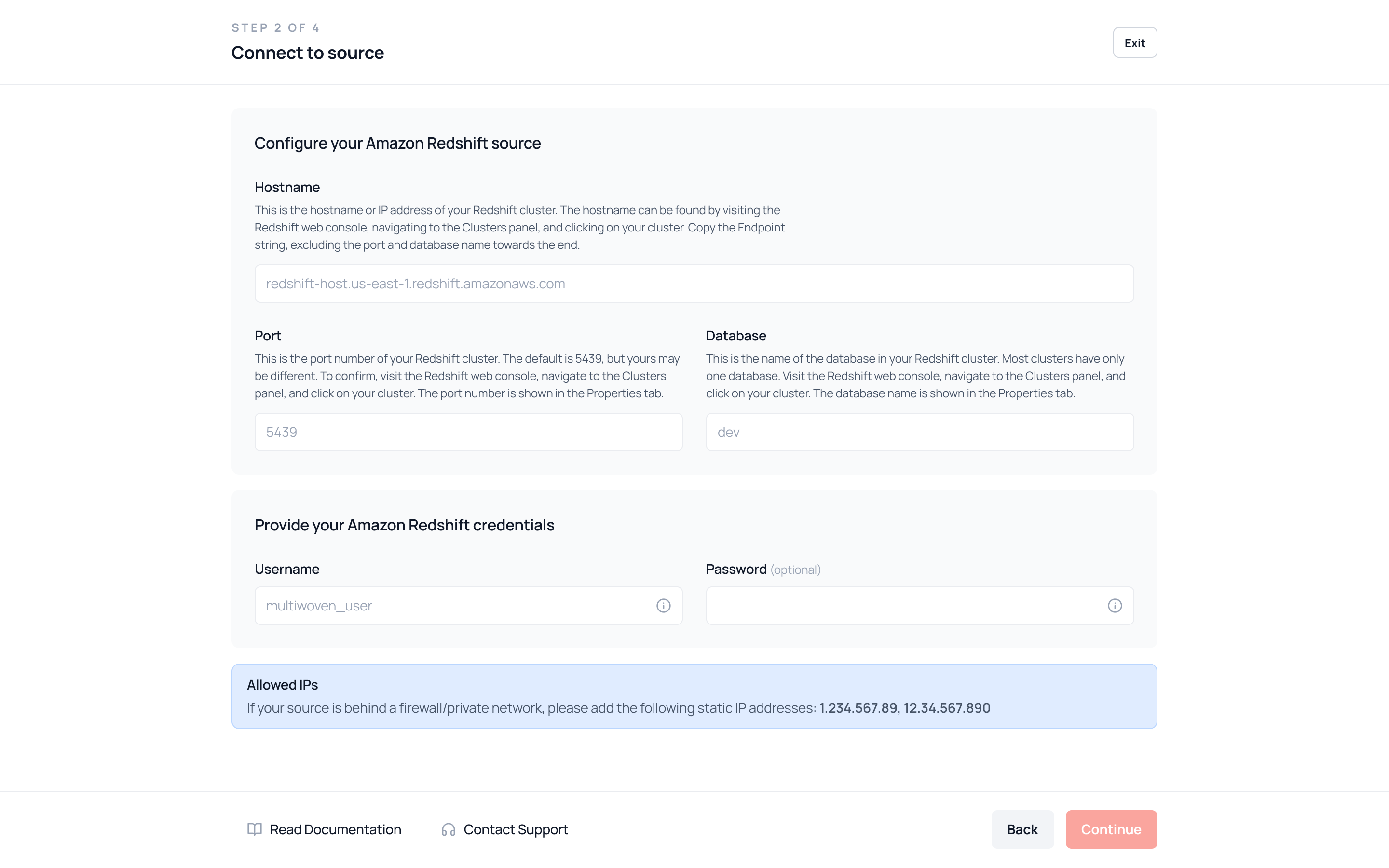 - Fill in the necessary credentials specific to your chosen data warehouse. This typically includes information like user IDs, passwords, API keys, or connection strings.