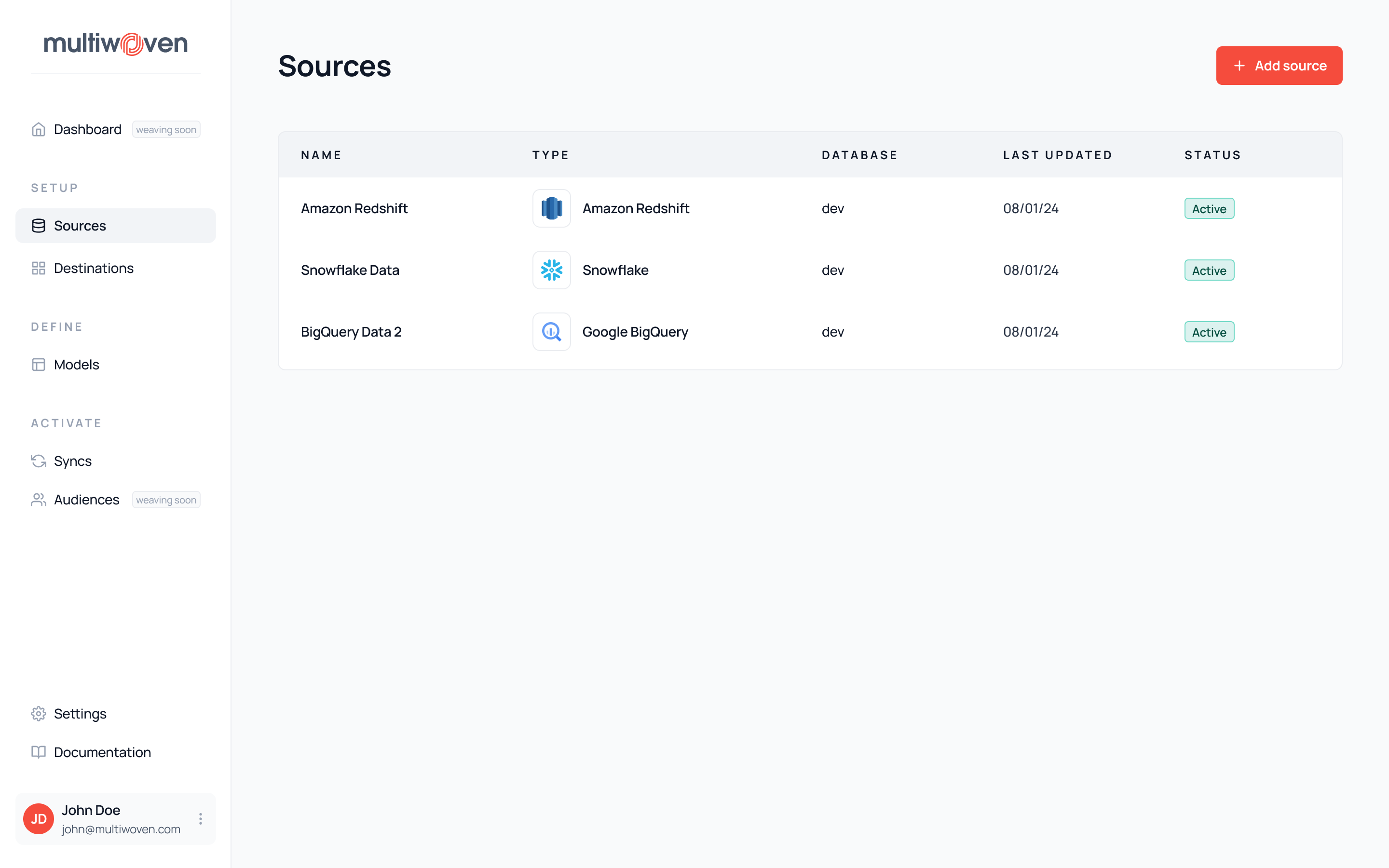 This overview provides a general guide on how to connect your data warehouse sources, such as Snowflake, Redshift, BigQuery, and Databricks, to Multiwoven.