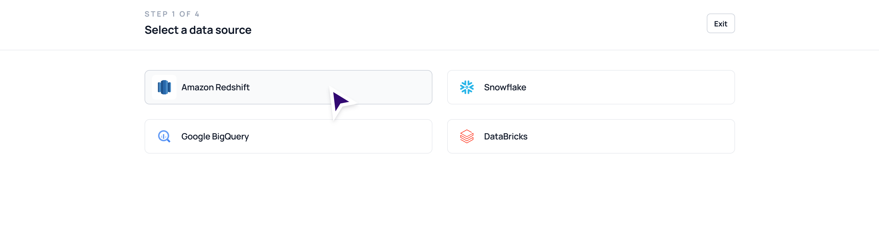 - Choose the data warehouse you’re connecting to from the provided list. This selection determines the credentials you’ll need to enter in the next step.